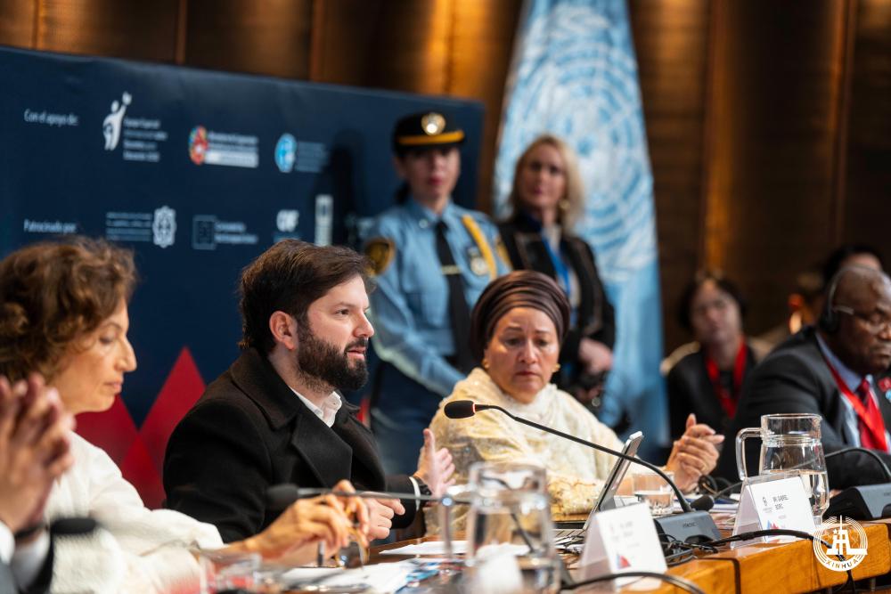 ↑8月28日,智利总统博里奇(左二)在首都圣地亚哥举行的首届联合国教科文组织世界教师峰会开幕式上致辞。新华社发(智利总统府供图)